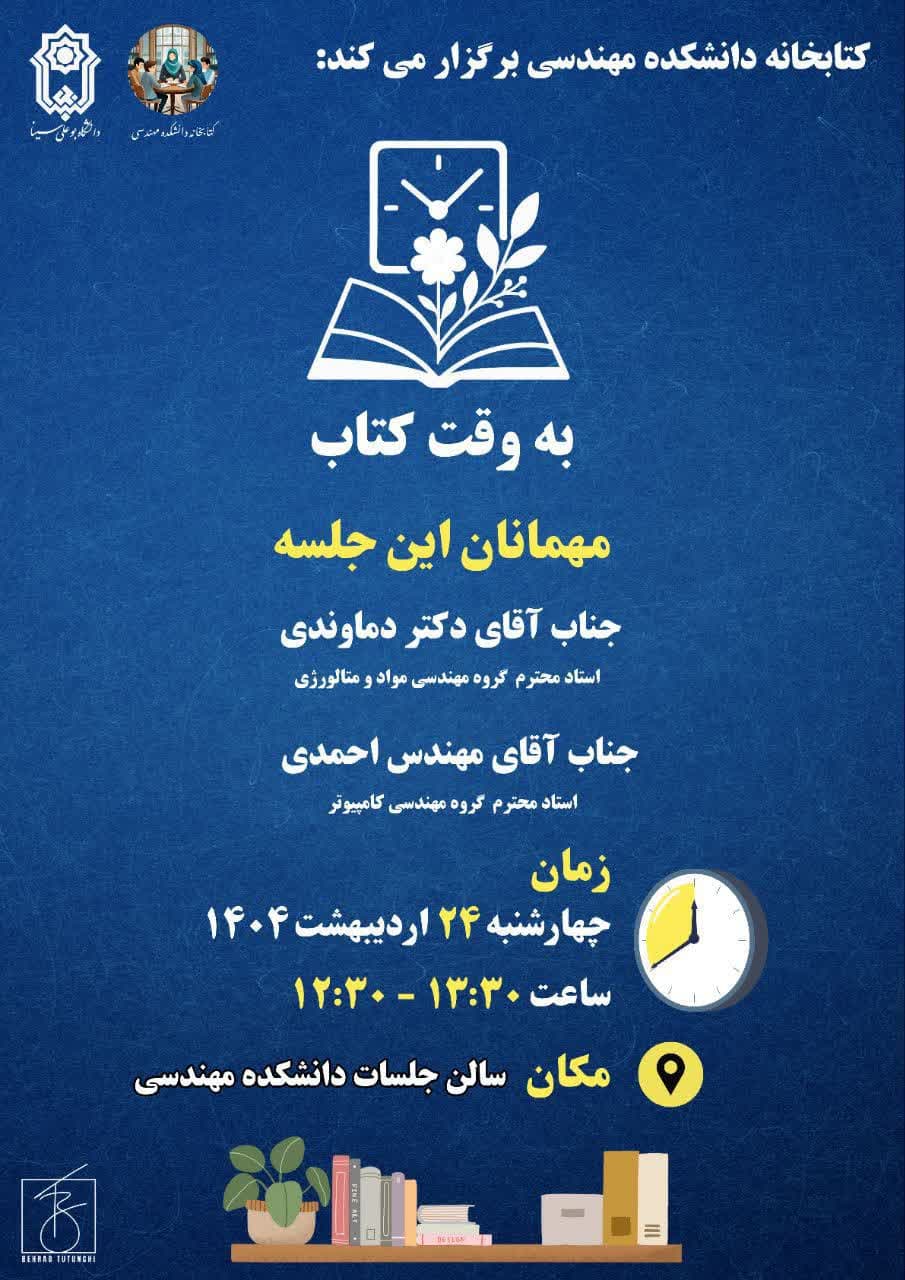 نشست گروه کتاب‌خوانی «به وقت کتاب» با حضور پرشور دانشجویان و اساتید در سالن جلسات دانشکده مهندسی دانشگاه بوعلی‌سینا برگزار شد. این رویداد صمیمی، فضایی پویا برای گفت‌وگو، مطالعه و تبادل اندیشه فراهم کرد، در این نشست، دو مهمان ویژه حضور داشتند:  دکتر دماوندی، استاد برجسته گروه مواد و متالورژی، مهندس احمدی، استاد گروه کامپیوتر و ادیب فرهیخته  سخنان ارزشمند این اساتید، به غنای برنامه افزود. همچنین، حضور غیرمنتظره دکتر دزفولیان، استاد پیشکسوت گروه کامپیوتر، با استقبال گرم دانشجویان همراه شد و بر جذابیت نشست افزود، راحله عباسی، دانشجوی گروه کامپیوتر، با ارائه‌ای خلاقانه درباره «اهمال‌کاری مغز»، بحث‌های پرباری را میان شرکت‌کنندگان رقم زد. شعرخوانی و مرور بخش‌هایی از کتاب‌ها نیز فضایی سرشار از احساس و اندیشه ایجاد کرد.